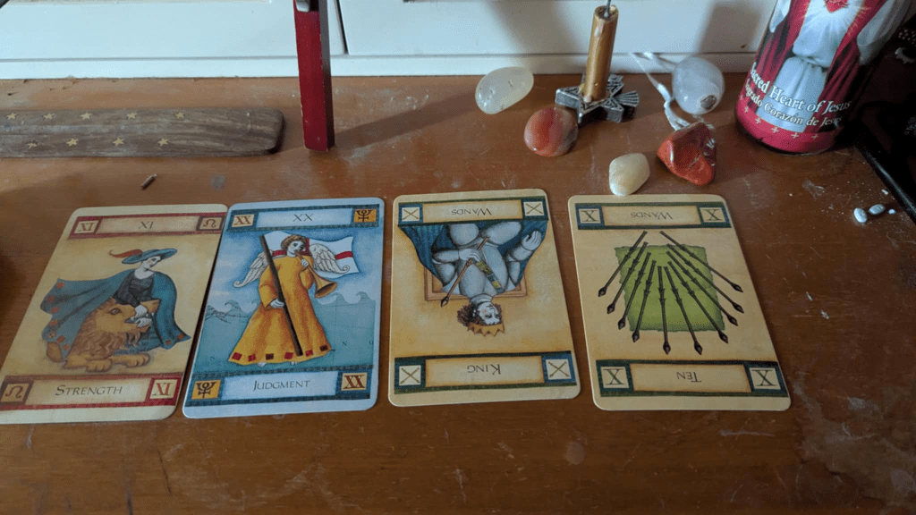 This is the pull I got from today’s section of where to read in the bible: Strength, Judgement, King of Wands (reversed) and ten of wands (reversed).